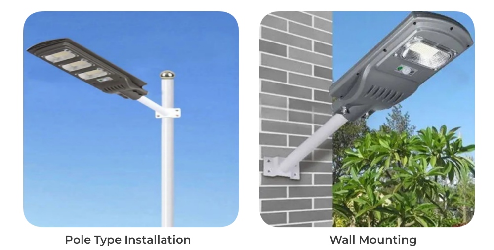 The solar powered road light supports two installation methods: wall installation and pole type installation. The wall installation option allows the light to be easily mounted on walls, fences, or other flat surfaces. The pole type installation option enables the light to be securely mounted on poles or lamp posts.